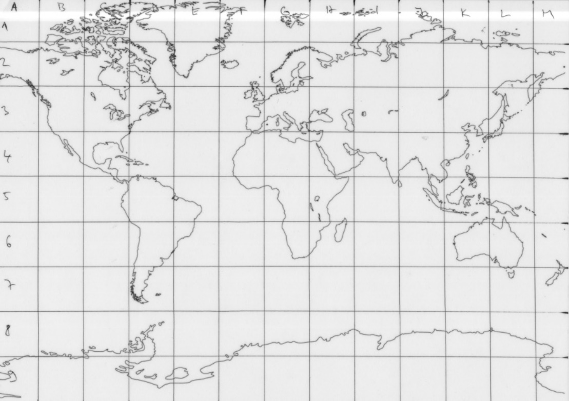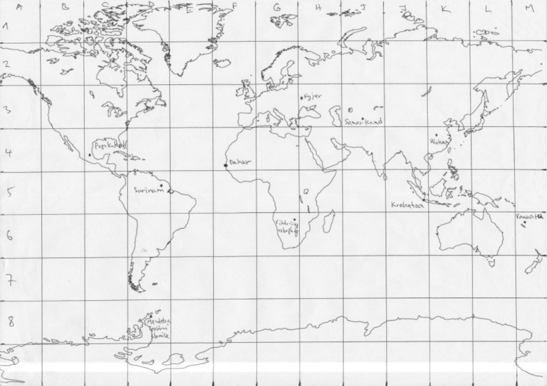 úkol: Slepá mapa - určete, ve kterém čtverci se nachází: 1. Dakar, 2. Krakatoa, 3. Kyjev, 4. Mendelova polární stanice, 5. Popokatepetl, 6. Samarkand, 7. Surinam, 8. Vanuatu, 9. Viktoriiny vodopády, 10. Wuhan